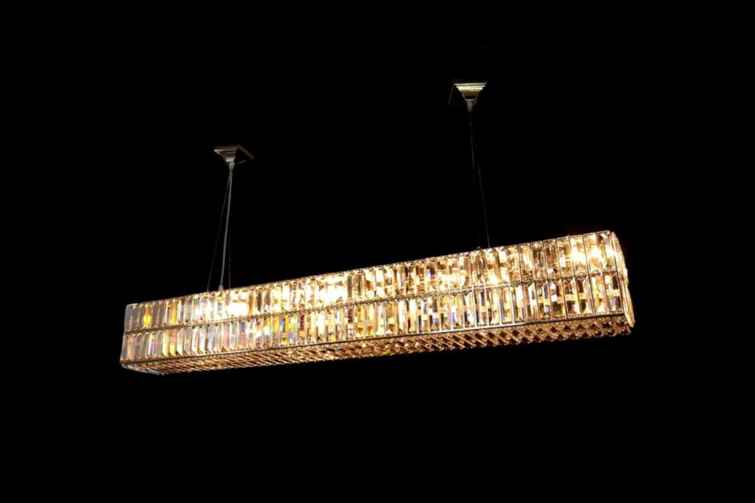 Die Länge des Kronleuchters ist 120 cm, die Breite ist 17,5 cm und die Höhe (ohne Säule) ist 17,5 cm, das Gewicht beträgt ca. 15 kg, der Kronleuchter benötigt 8 Leuchtmittel (E14 LED).