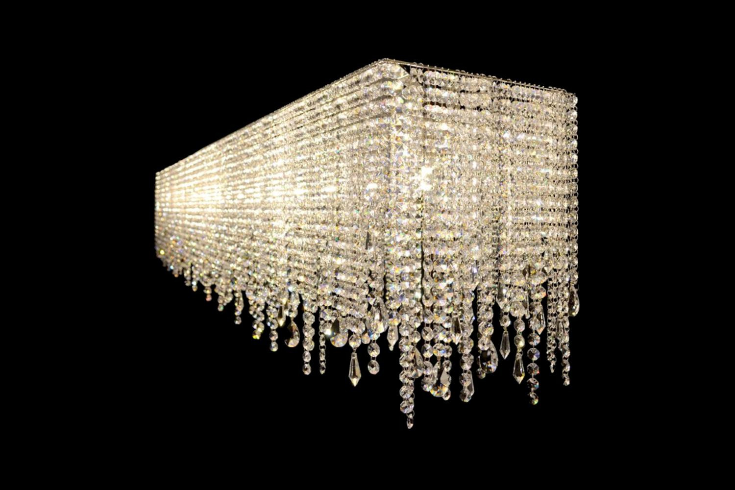 Die Länge des Kronleuchters ist 220 cm, die Breite ist 28 cm und die Höhe ist 40 cm, der Kronleuchter benötigt 12 Leuchtmittel (G9 LED).