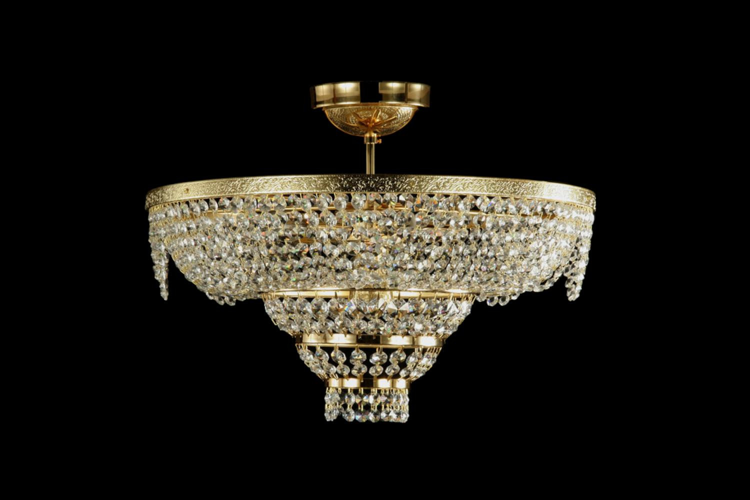 The hanging on this ceiling crystal chandelier is lavish, almost a little extravagant, but this is fully intentional. Many elements have been combined here to create the most pompous impression possible and to amaze onlookers. The luxurious look therefore comes into its own almost perfectly, especially in the colour gold.