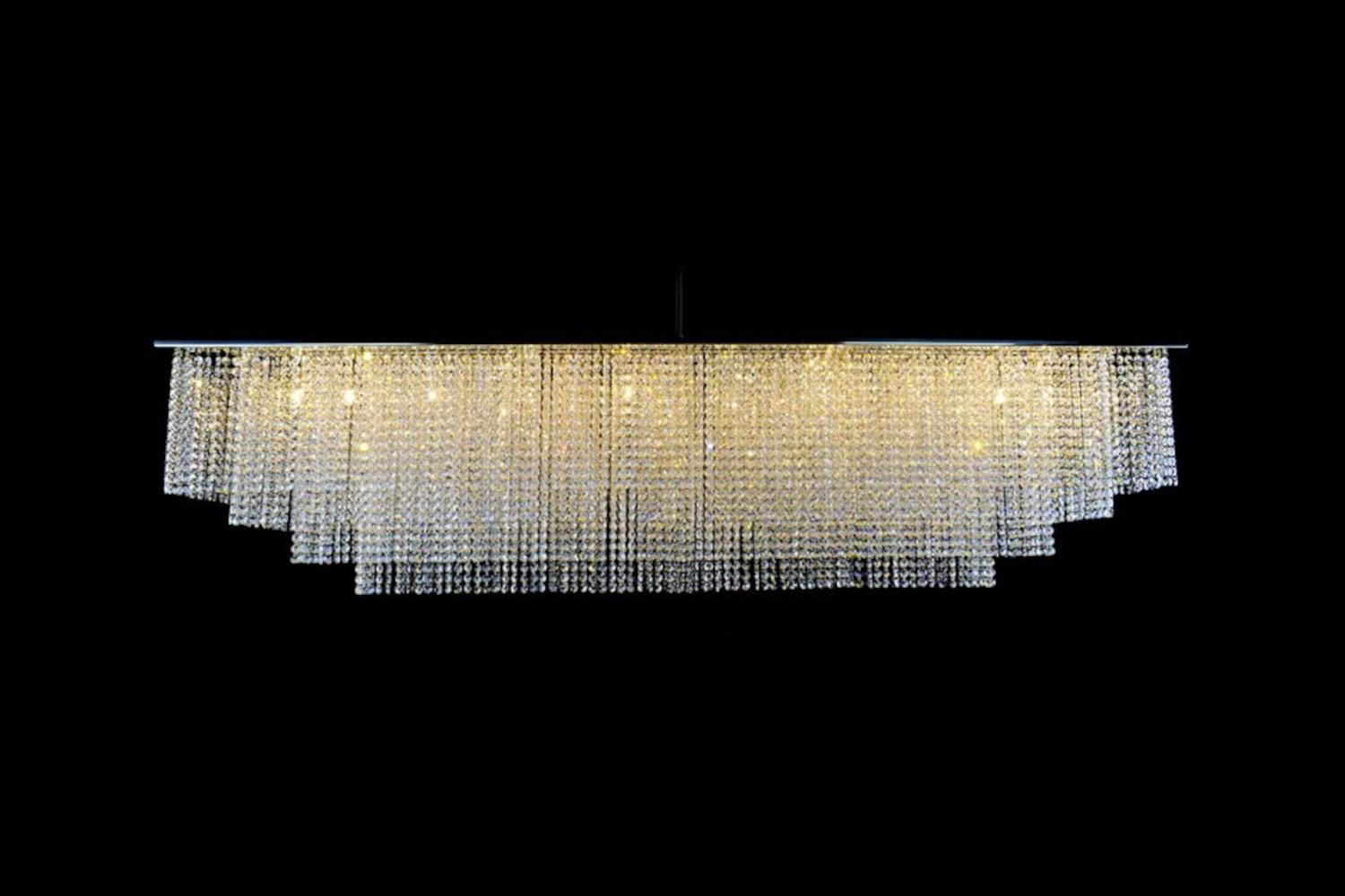 Measuring approximately 180 centimetres long, 40 centimetres wide and 40 centimetres high (without column), the crystal chandelier is the ideal size for special rooms or for mounting above special tables and panels. The impressive piece weighs 37 kilograms and requires 12 G9 illuminants for operation.
