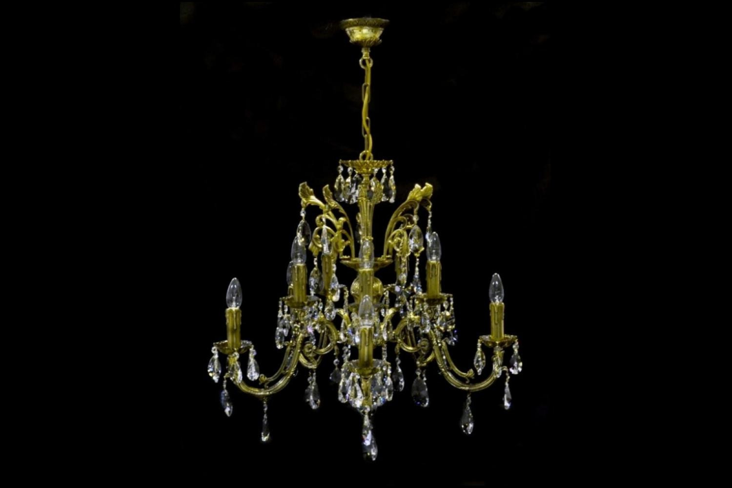 The chandelier is made of cast parts and the finest crystal with a high lead content. This impressive chandelier is suitable for both classic and modern interiors. The polished brass is coated with a protective layer.