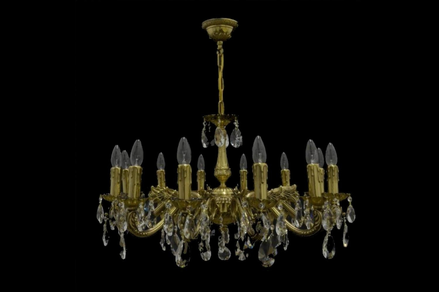 The chandelier is made of cast parts and the finest crystal with a high lead content. This impressive chandelier is suitable for both classic and modern interiors. The polished brass is coated with a protective layer.
