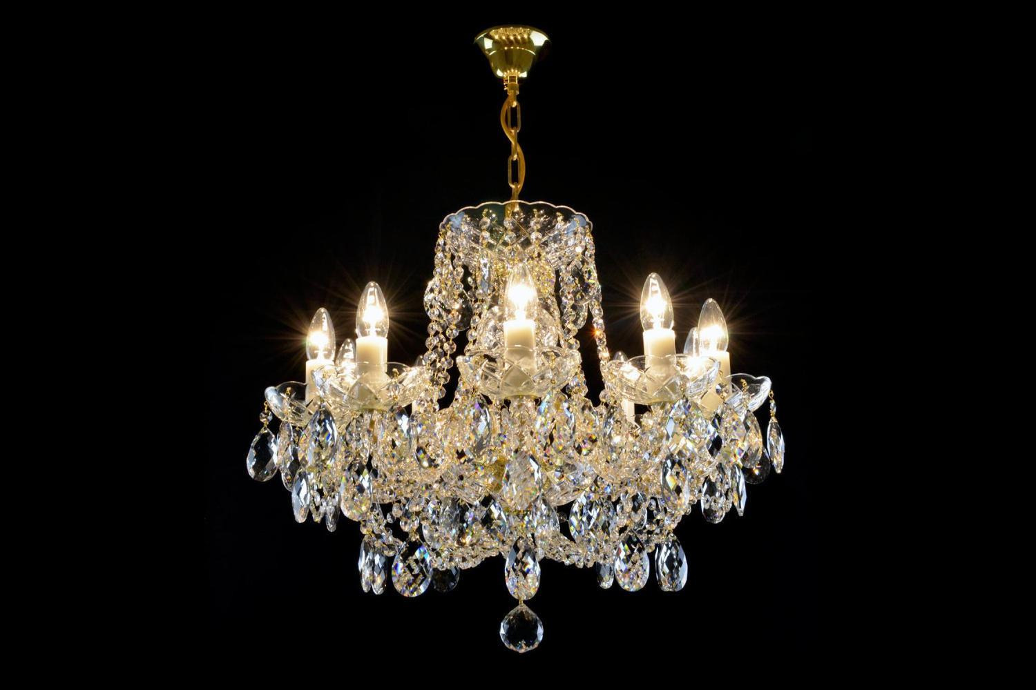The glass arms and other parts of this magnificent crystal chandelier are made of high-quality Bohemian crystal glass. The hanging is plentiful and of high quality with a high lead content. The gold or silver-coloured metal parts are provided with a protective coating.