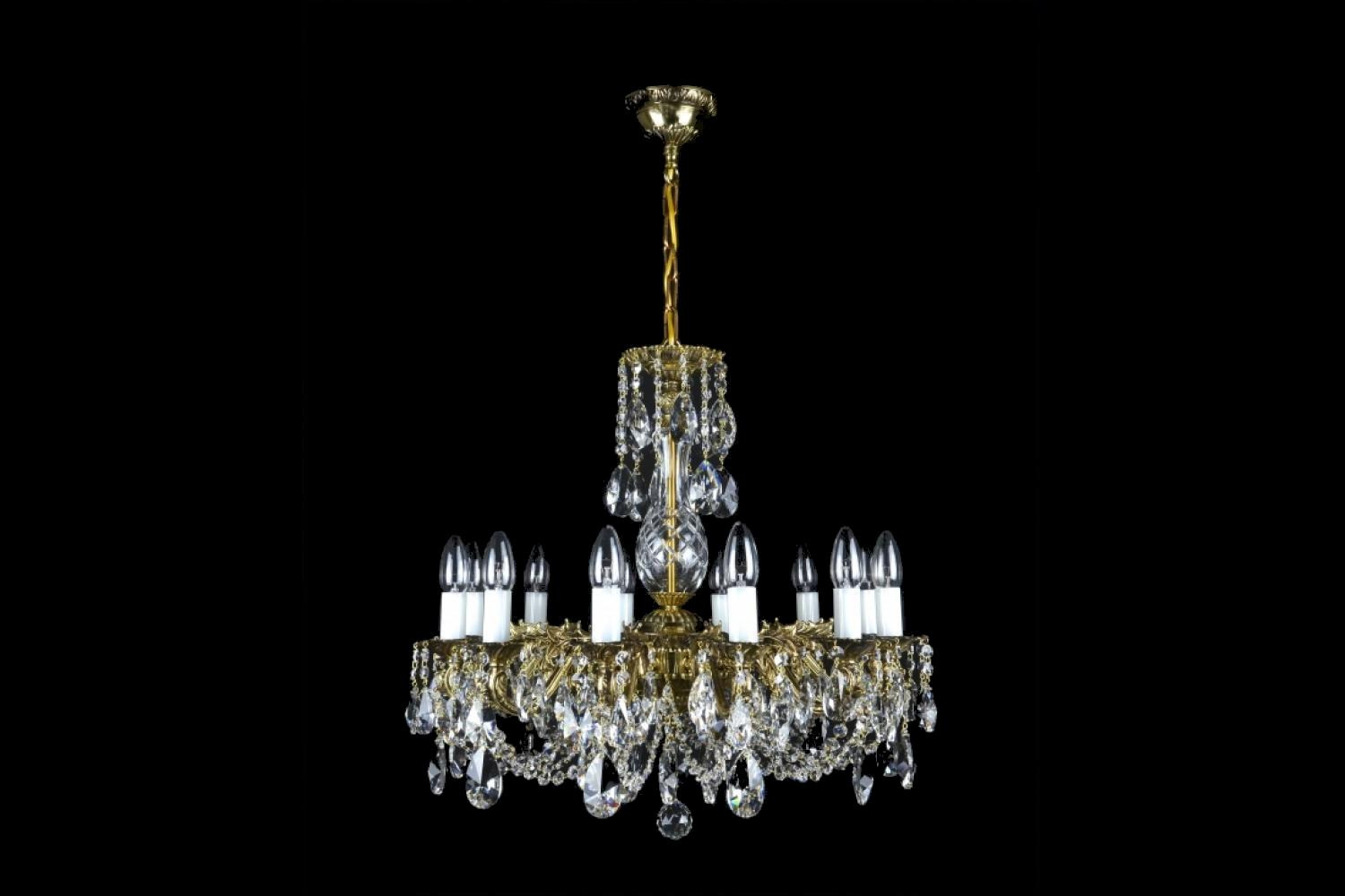 The chandelier is made of cast parts and the finest crystal with a high lead content. This impressive chandelier is suitable for both classic and modern interiors. The polished brass is coated with a protective layer.