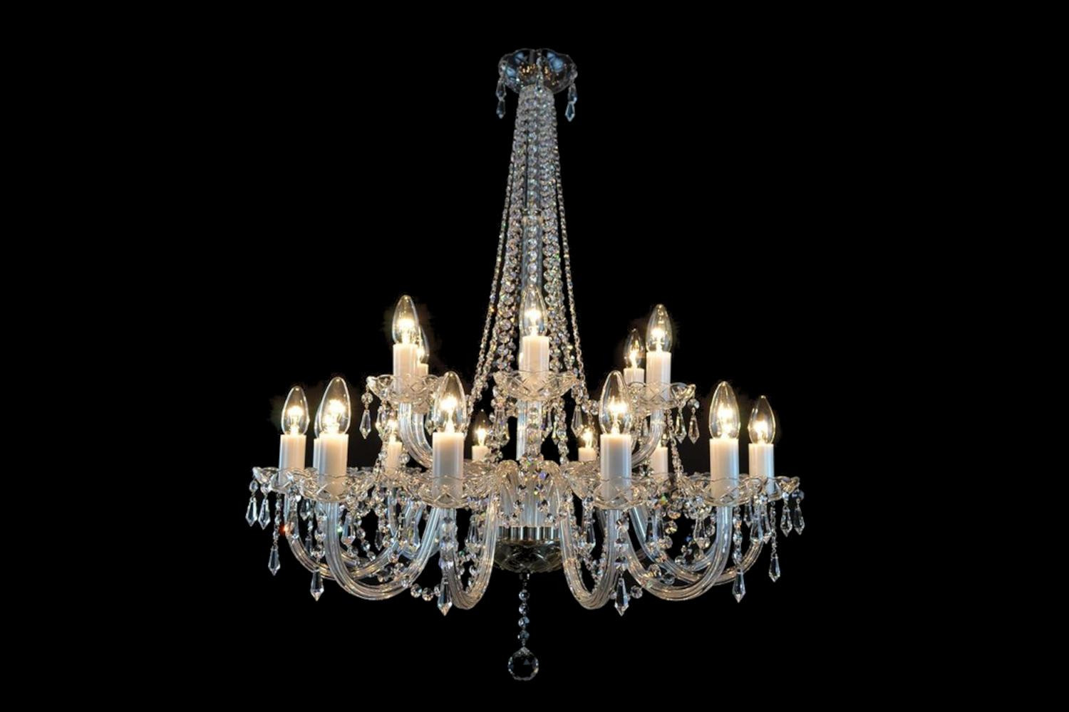 Le lustre en cristal au plomb lui-même a un diamètre solide de 75 centimètres et mesure environ 90 centimètres de hauteur (sans la chaîne). Son poids plume de 9,5 kg lui permet de tenir presque partout et donc d'être fixé sans problème.