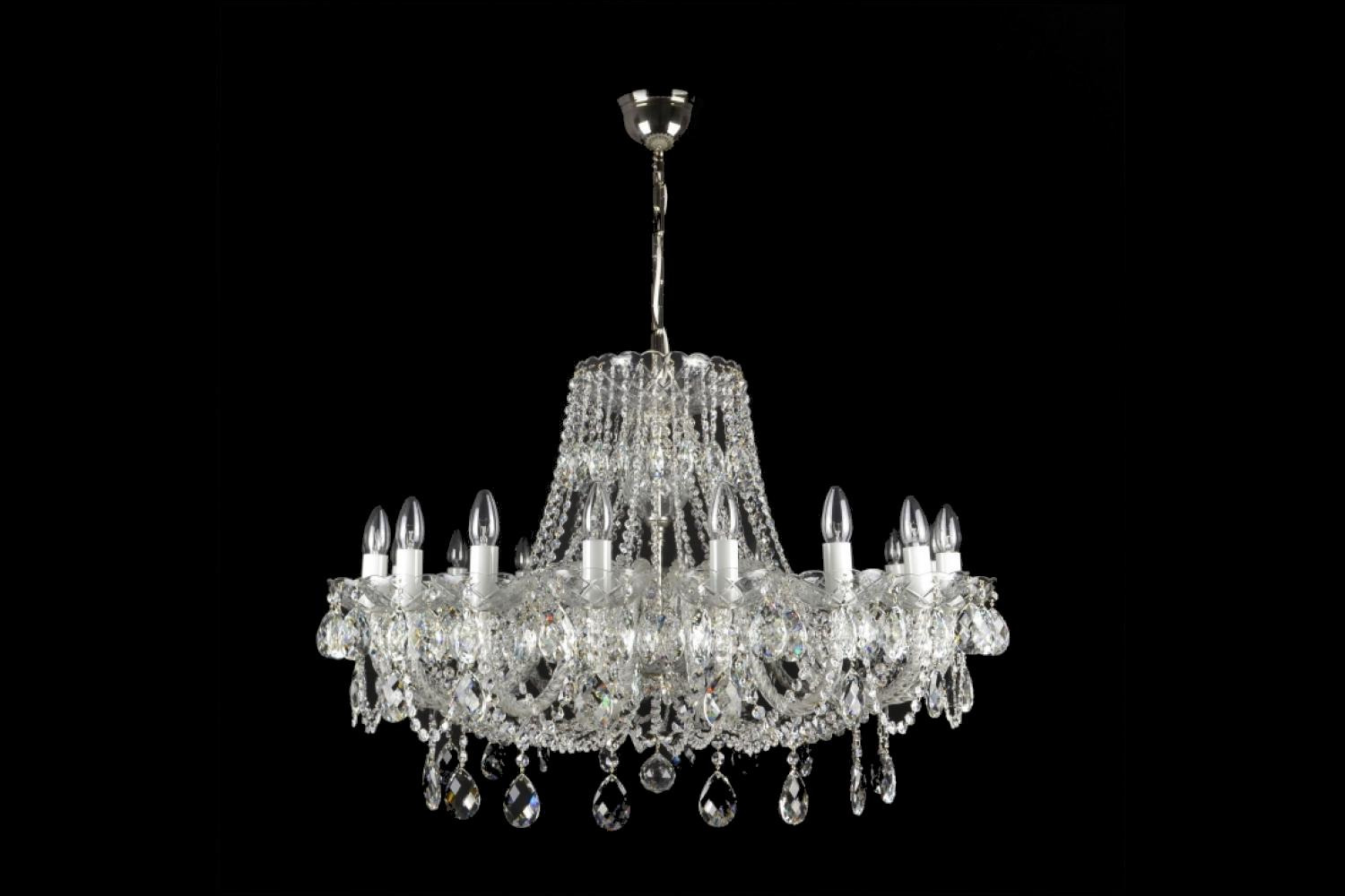 Avec un diamètre de 95 centimètres et une hauteur de 58 centimètres (sans la chaîne), le lustre en cristal possède une taille magnifique. Avec ses 25 kilos, il montre en outre clairement la qualité et la solidité de sa finition, ainsi que la valeur du cristal au plomb et des suspensions. Cette œuvre d'art en verre de cristal est éclairée par 18 ampoules de la douille E14.