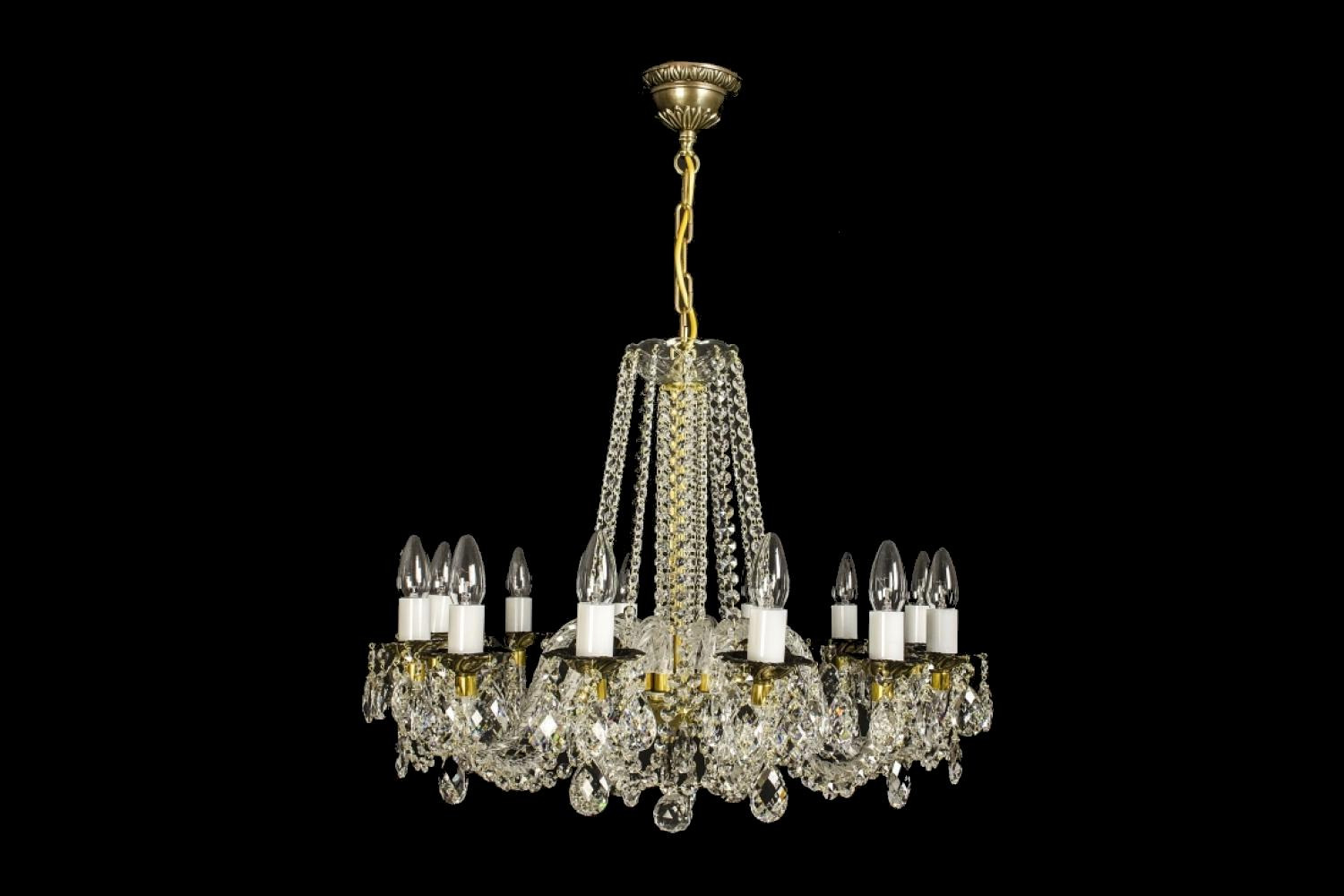 Le lustre est composé de pièces en fonte et de cristal très fin à haute teneur en plomb. Cet impressionnant chandelier convient aussi bien à un intérieur classique que moderne. Le laiton poli est recouvert d'une couche de protection.